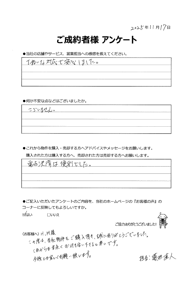 この度は、当社物件をご購入頂き、誠にありがとうございました。