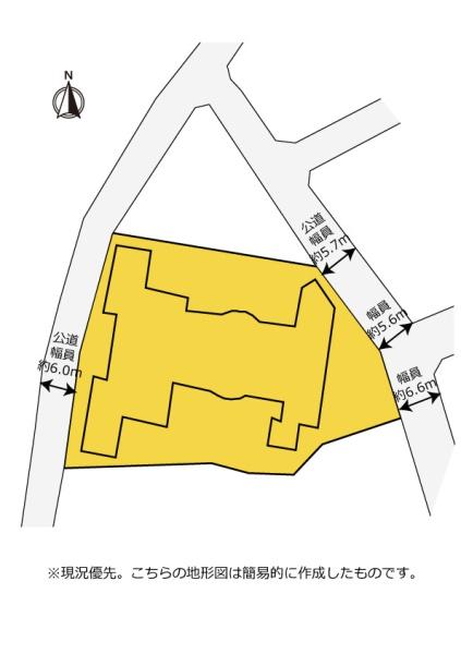 | 現況/引渡し | 上物あり/相談 | 接道状況 | 接道: 東 公道 道路幅: 5.6m 接道: 西 公道 道路幅: 6m |