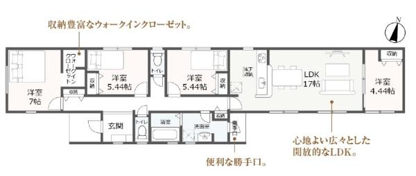 築年月 | 2026年1月築 | 間取り | 4LDK (LDK17/洋室7/洋室5.44/洋室5.44/洋室4.44) | ||