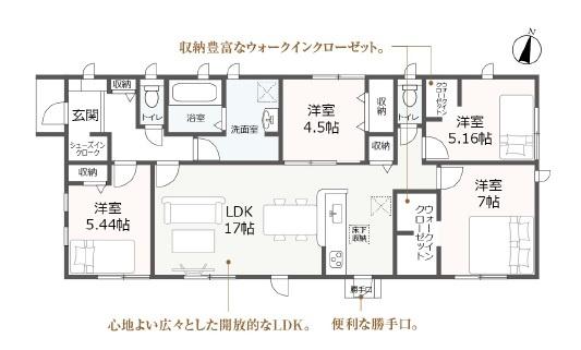 築年月 | 2026年1月築 | 間取り | 4LDK (LDK17/洋室7/洋室5.44/洋室5.16/洋室4.5) | ||