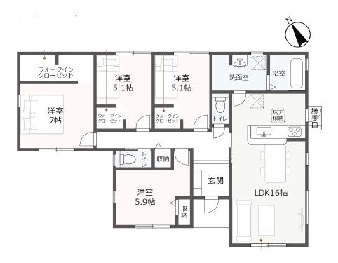 • 間取り図 全室フローリングの4LDK、平屋建て! ウォークインクローゼット3部屋、トイレ2ヶ所付き♪