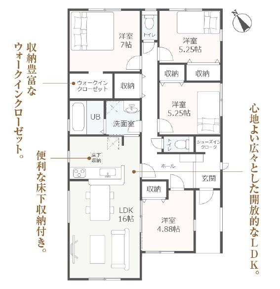 | 築年月 | 2026年5月築 | 間取り | 4LDK (LDK16/洋室7/洋室5.25/洋室5.25/洋室4.88) | ||