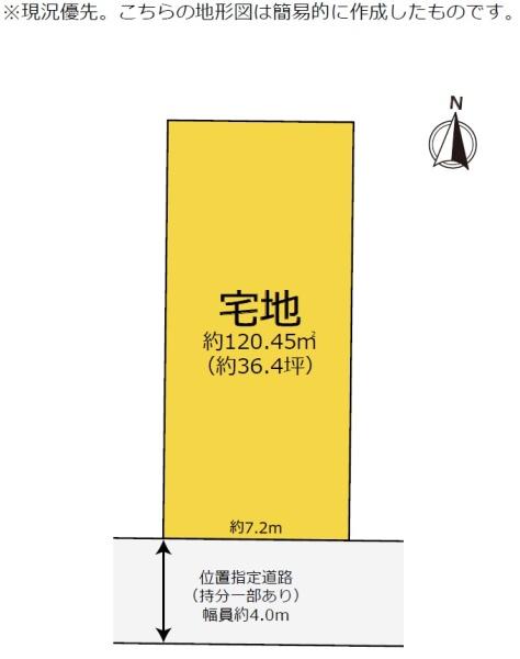 | 現況/引渡し | 上物あり/相談 | 接道状況 | 接道: 南 7.2m 私道 道路幅: 4m |