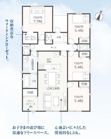 | 築年月 | 2026年5月築 | 間取り | 4LDK (LDK16/洋室7.5/洋室5.4/洋室5.4/洋室5.4) | ||