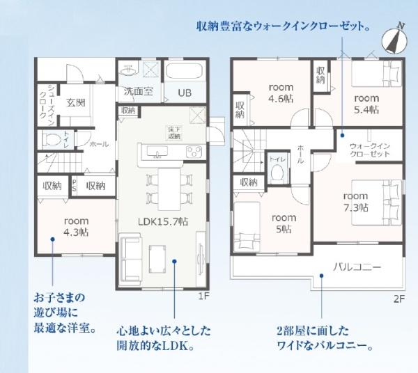 | 築年月 | 2026年5月築 | 間取り | 5LDK (LDK15.7/洋室4.3/洋室7.3/洋室5.4/洋室5/洋室4.6) | ||