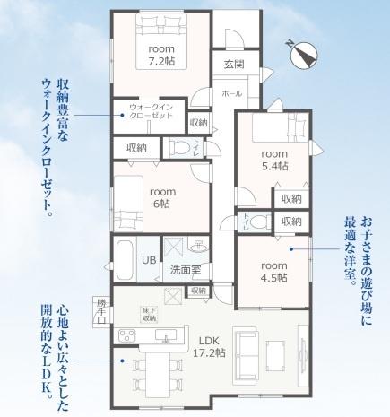 | 築年月 | 2026年7月築 | 間取り | 4LDK (LDK17.2/洋室7.2/洋室6/洋室5.4/洋室4.5) | ||