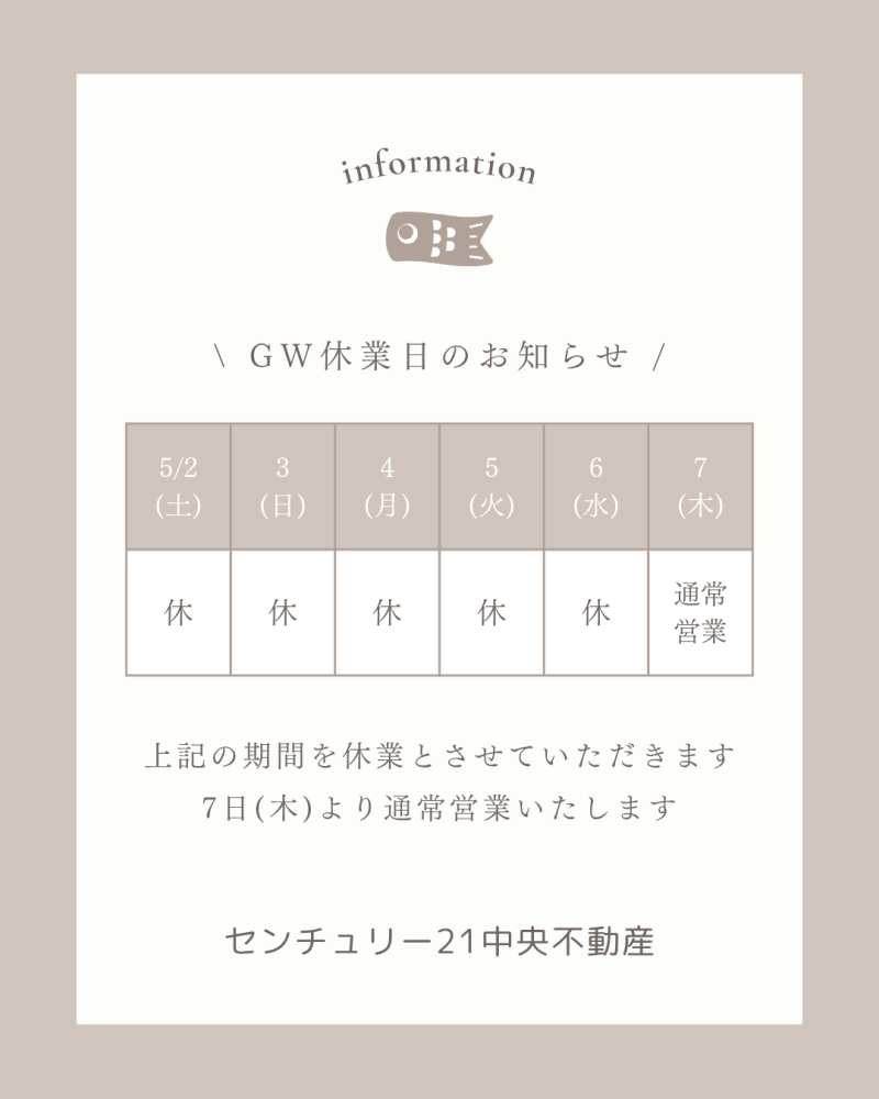 - 浜松の不動産売買 磐田の不動産売買 静岡の不動産売買 豊橋の不動産売買|ゴールデンウィーク期間中の休業について。浜松・磐田・静岡・豊橋の不動産会社センチュリー21中央不動産