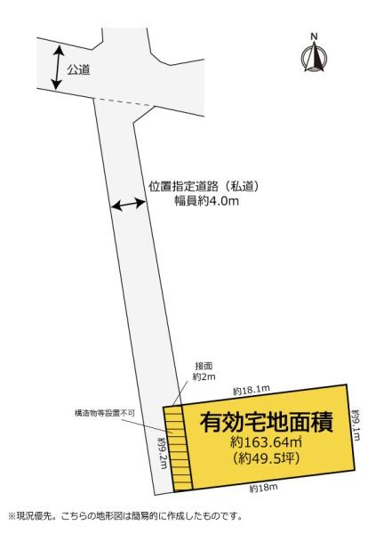 | 現況/引渡し | 上物あり/相談 | 接道状況 | 接道: 北 2m 私道 道路幅: 4m |