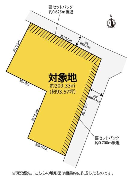 | 現況/引渡し | 上物あり/相談 | 接道状況 | 接道: 北 19m 公道 道路幅: 2.75m 接道: 東 21.5m 公道 道路幅: 3.3m |