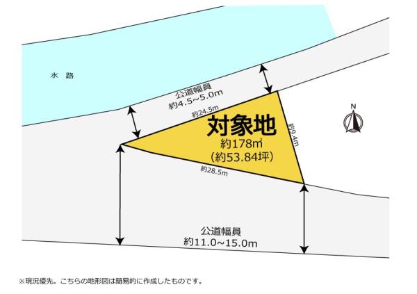 | 現況/引渡し | 更地/相談 | 接道状況 | 接道: 北 24.5m 公道 道路幅: 4.8m 接道: 南 27.7m 公道 道路幅: 12.5m |