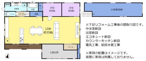 【リフォーム工事プラン付販売】太陽光発電システム・オール電化・平家建・2LDK+小屋裏収納・駐車4台可(車種による)・契約後の工事着工につき、引渡し日要相談。