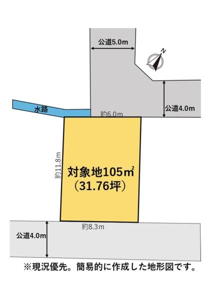 | 現況/引渡し | 上物あり/相談 | 接道状況 | 接道: 北西 6m 公道 道路幅: 4m 接道: 東南 8.3m 公道 道路幅: 4m |