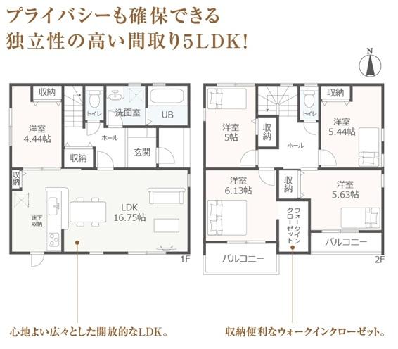 | 築年月 | 2026年4月築 | 間取り | 5LDK (LDK16.75/洋室4.44/洋室6.13/洋室5.63/洋室5.44/洋室5) | ||