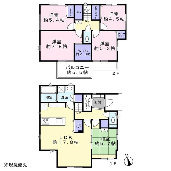 | 築年月 | 2024年11月築 | 間取り | 5LDK (LDK17.8/和室5.7/洋室5.4/洋室4.5/洋室5.3/洋室7.8) | ||